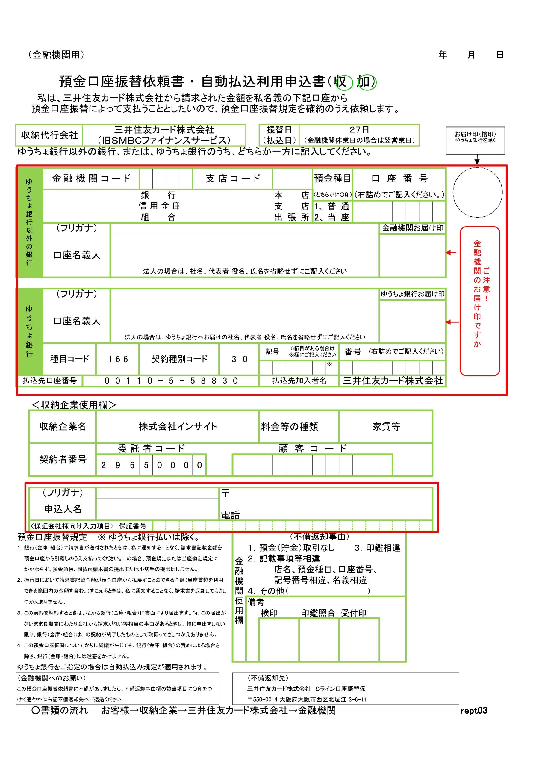 今後は必ず右下に「rept03」と記載のある 預金口座振替依頼書・自動払込利用申込書 を賃借人様にご記入いただくよう、ご案内をお願いいたします。
